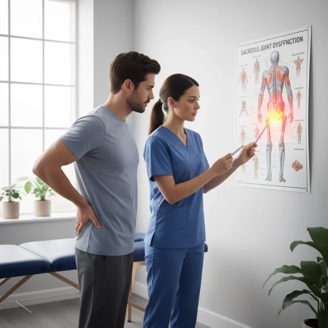The sacroiliac joint (SI joint), is synovial/fibrocartilage two joint complex between the pelvic bones and the sacrum. It is the source of pain for many women during or after pregnancy, which may spontaneously resolve within months (but why suffer that long?). For a small percentage of post-partum women, this dysfunction can last years after the delivery.(22) Furthermore, the natural course of this problem is yet unresolved.(23) It has been documented that conservative care in the form of physical therapy can provide relief for a high percentage of patients.(24) Often times conservative management coupled with specific exercises can help men and women balance musculature that may contribute to the SI joint dysfunction.(25) If you suffer from SI joint dysfunction symptoms you should speak with our doctor of chiropractic to obtain a proper joint movement evaluation and diagnosis to institute treatment for you.